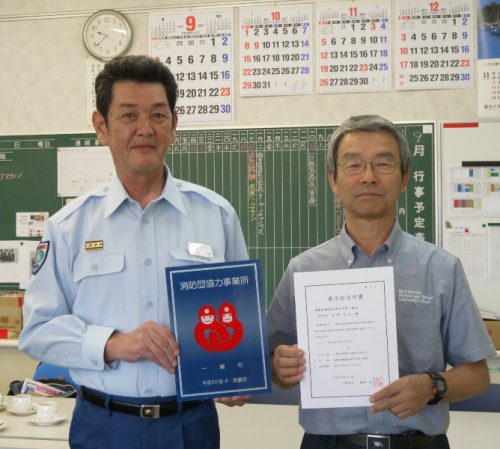 この度、当校に一関市消防団協力事業所の表示証が交付されました。