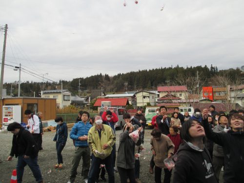 紅白の餅やお菓子がまかれました。